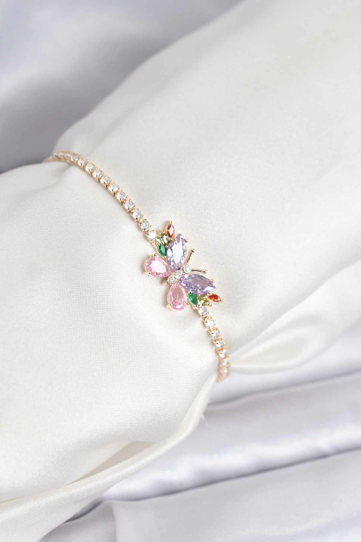 Renkli Kelebek Model Zirkon Taşlı Asansörlü Su Yolu Kadın Bileklik - 266982
