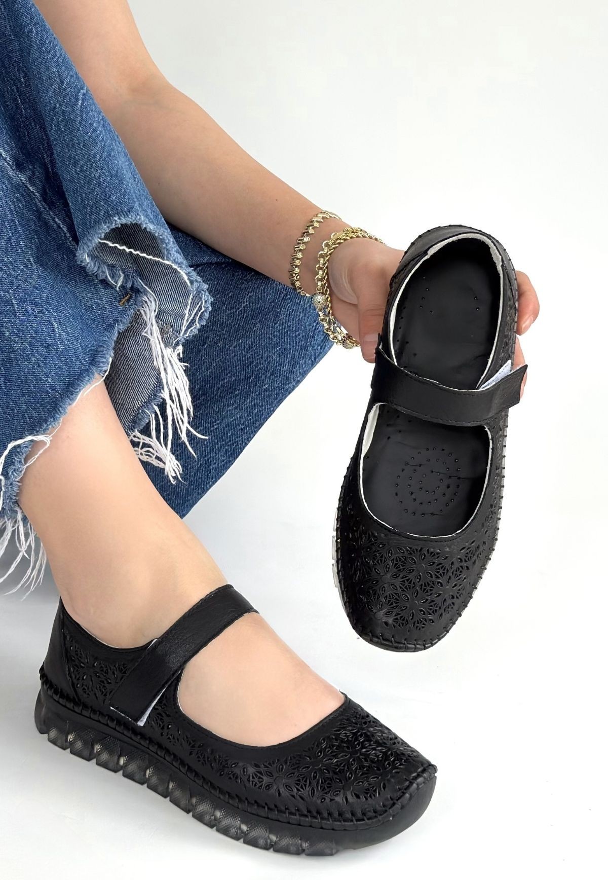 Sina Siyah Deri Cırt Cırtlı Babet Ayakkabı - 268271