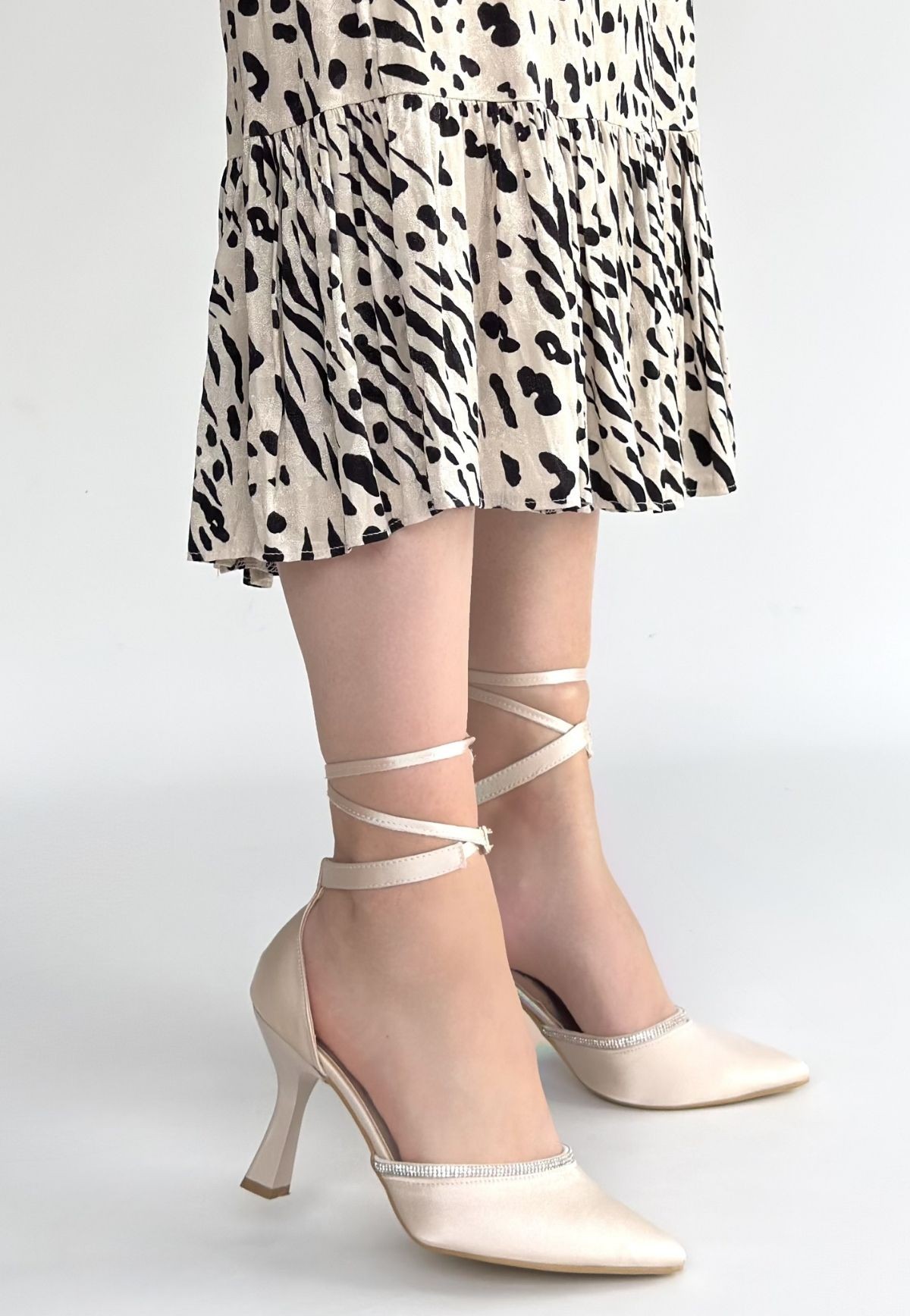 Tenja Bej Saten Bilekten Bağcıklı Topuklu Ayakkabı - 267816