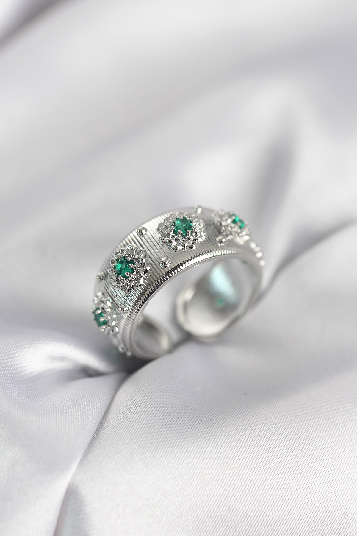 Yeşil Zirkon Taşlı Gümüş Renk Vintage Kadın Yüzük - 267625
