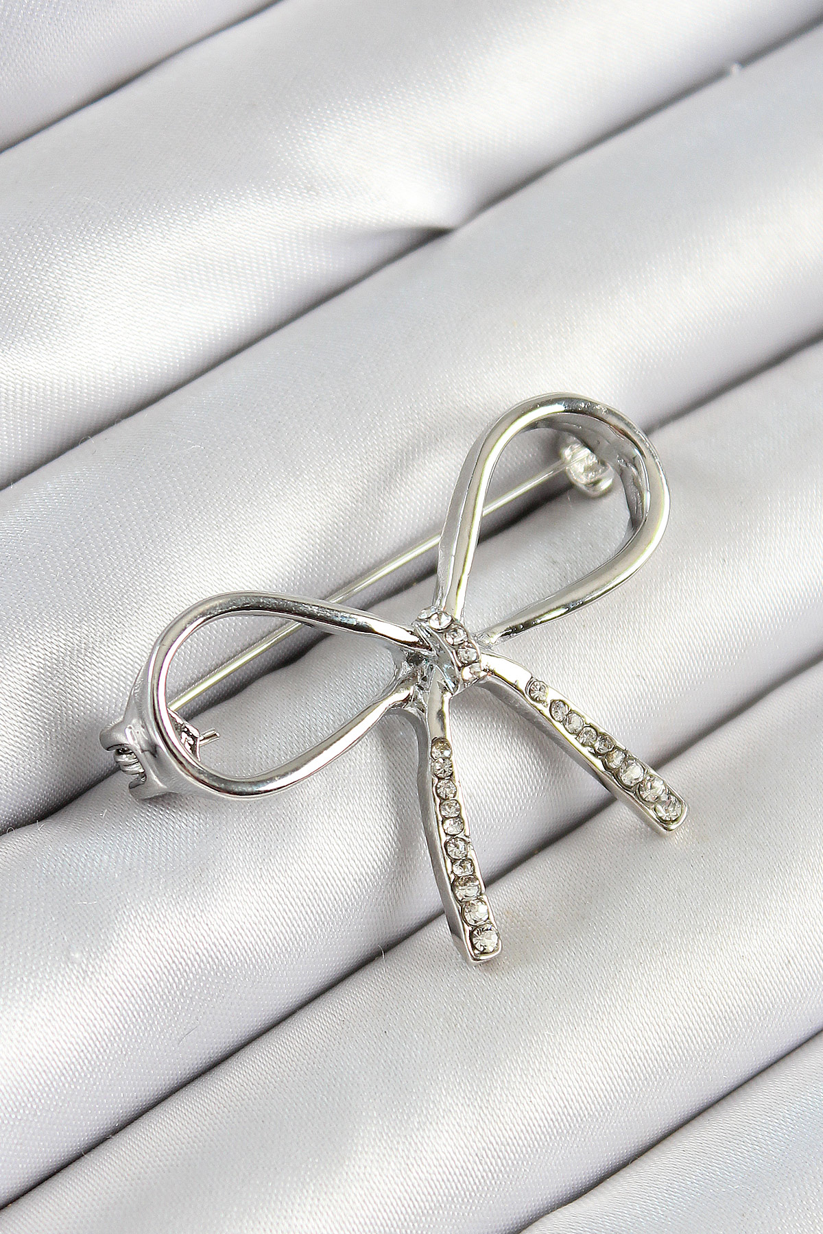 Zirkon Taş Detaylı Fiyonk Figürlü Gümüş Renk Kadın Broş - 262875